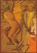 Just at that moment the lion breaks free, charging out of the castle to hurl himself on the nearest demon. He knocks him over like a tree and is on him at once with claws and teeth. The other turns to help him, but Yvain is not so foolish as to miss this chance and slices his neck from his shoulders.