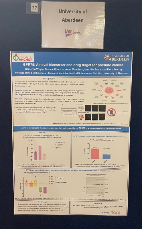 I was delighted to have the opportunity to present findings obtained during my summer research project “GPR75: A novel biomarker and drug target for prostate cancer” in the Houses of Parliament, Westminster in March 2025.