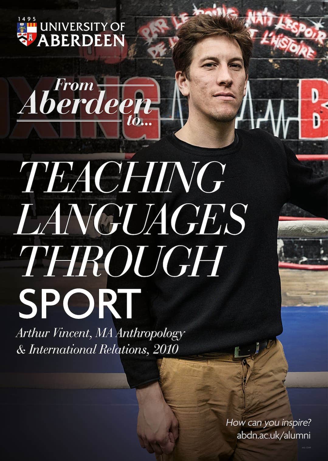 Arthur Vincent is an MA in Anthropology & International Relations graduate from 2010. He currently resides in Aubervilliers, France and founded a non-profit which teaches languages through sport to athletes from underserved areas. Read an interview transcript with Arthur Vincent here . View Arthur's alumni relations promotional poster here .