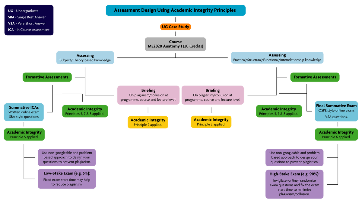To minimise the opportunity for academic misconduct this course adopts a number of approaches to promote academic integrity. First, the opportunity to explain and discuss the assessment with students is built into the course, as well as advising students how they might avoid potential academic integrity breaches. Second, randomised exam questions in online exams, non-googleable and problem-based approaches in question design were implemented. Third, rather than having a single high-stake assessment, several formative and low stake assessments are used throughout the course, this can reduce student stress and provide feedback to prepare for the final exam. The approaches used in the first year Anatomy course map onto Dublin City University (DCU), Academic Integrity Principles (link: 12 academic integrity principles ) for Assessment Design, specifically, principles Number 2, 5, 6, 7 and 8 (see the diagram below).