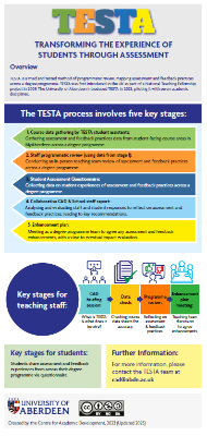First introduced at Aberdeen in 2022, Transforming the Experience of Students Through Assessment (TESTA) is a method of programmatic review which maps Intended Learning Outcomes (ILOs), assessment and feedback practices across a degree programme to identify areas of enhancement and effective practice in higher education.