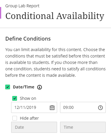 • Visible to students: You can show the item to the students before they are able to access it. In this case the students will be able to see either the dates that the item will be available or the information about their access based on their performance.