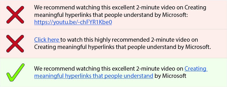 Don't do this. Watch this excellent 2-minute video on Creating meaningful hyperlinks that people understand by Microsoft: https://youtu.be/-chFYR1Kbe0 Don't do this. Click here to watch this excellent 2-minute video on Creating meaningful hyperlinks that people understand. Do this. Microsoft have an excellent 2-minute video on Creating meaningful hyperlinks that people understand.