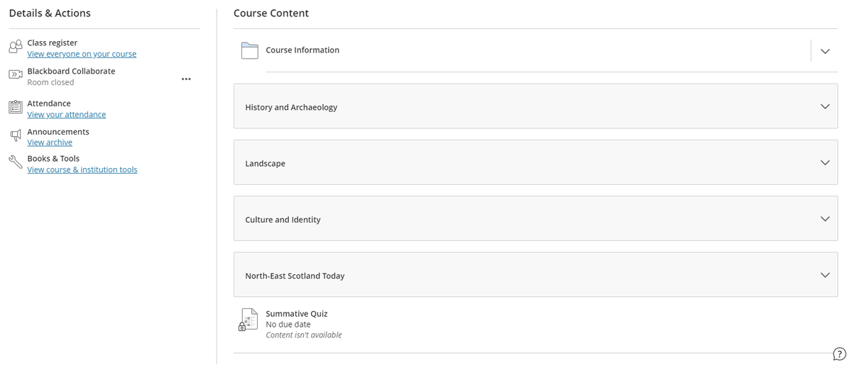 The content of the course is divided into four topics: 'History and Archaeology', 'Landscape', 'Culture and Identity' and 'North-East Scotland Today'. Each main topic is then further divided into folder subtopics, with each folder containing a mixture of mini-lecture documents, video or audio media, reading lists and a quiz to round-up each subtopic.