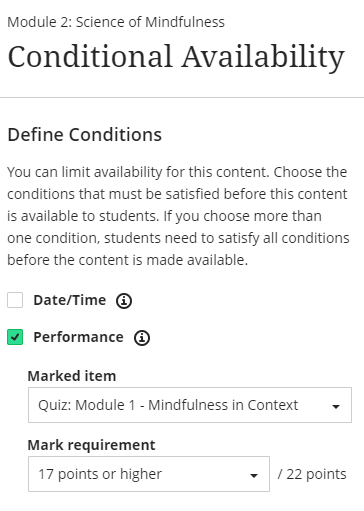 There are two ways of setting the Conditional Availability for your course, either by Date or by Performance. For Discovering Mindfulness (Learning) this was set only by Performance.