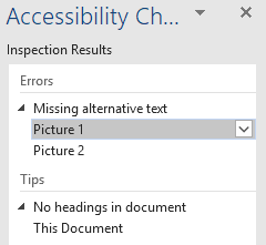 • Use the drop down menu to quickly fix issues, for example, add a description (alt text) to images in a document.