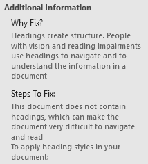 • Accessibility Checker will provide information and instructions on how to fix each of the issues highlighted.
