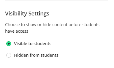 Finally, when you set up the Conditional Availability you can also manage the Visibility Settings, by making an item either Visible to students or Hidden from their view.