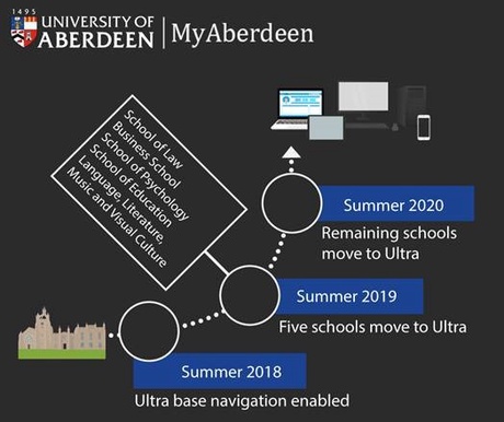 This summer, the University has started the phased switch over to a new look course page in MyAberdeen, called the Ultra Course View. Five schools will start to use this new view from 2019/2020 academic year. They are: Education, Business, LLMVC, Psychology and Law. The remaining schools will move to Ultra the following year.