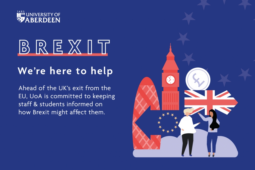 These sessions - advertised under the message ‘Brexit – we’re here to help’ – will provide a visible presence across our Foresterhill and Old Aberdeen campuses to offer reassurance and advice, signposting students and staff to our dedicated Brexit webpages for answers to their questions, or for more complex matters, to our Brexit email address brexit@abdn.ac.uk