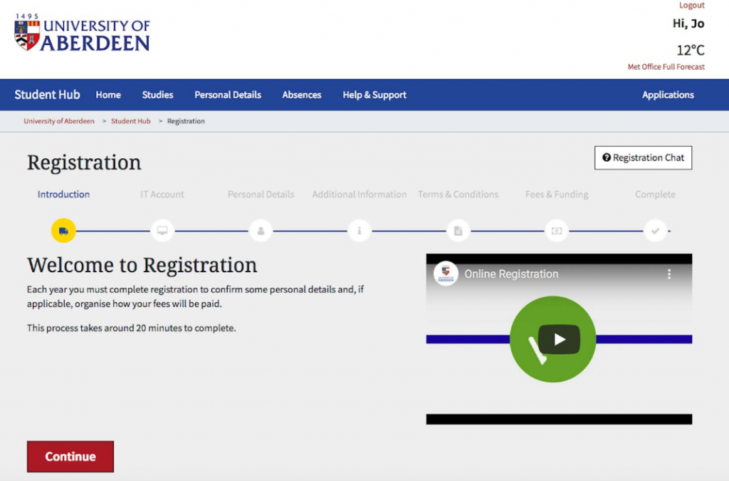 To become a fully registered student at the University of Aberdeen, students need to confirm some personal details and, if applicable, organise how fees will be paid by completing online registration.