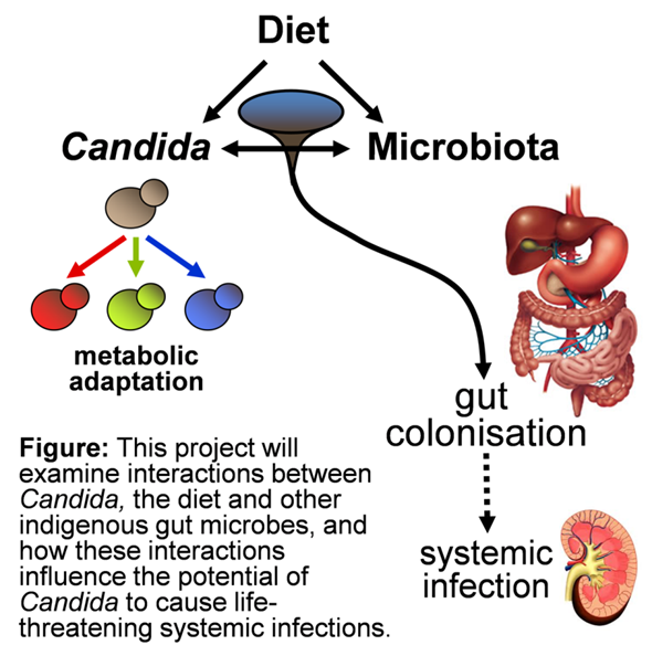 In this project we will test the feasibility of these ideas by defining how Candida interacts with the microbiota of the human gut [Figure]. We will test how this yeast competes with these other microbes for the local nutrients in the gut, and how this competition is influenced by local immunological defences. In doing so we will establish an important new collaboration between the Aberdeen Fungal Group and the Rowett Institute of Nutrition and Health.