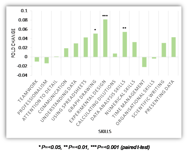 To assess the effectiveness of the workshop sessions students were surveyed before and after the workshop series, with 210 and 171 respondents respectively, from a class of 231. All questions were a 7-point Likert scale asking students to rate their personal effectiveness in 15 different skill sets. From this three skill sets showed a significant improvement in student confidence for graph drawing, experimental design and data analysis (see Fig. 1 below).