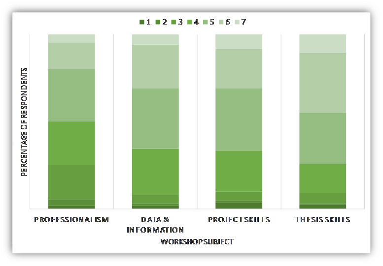 Further to surveying the impact of the workshops, students were also asked for feedback on the workshops, which was positive with over 50% of respondents scoring 5 out of 7 or higher for satisfaction (see Fig. 2 below) for all workshops, and three out of the four workshops scoring over 65% of respondents scoring 5 or higher. All workshops had very few (less than 10%) of respondents scoring negatively with scores of 3 or less.