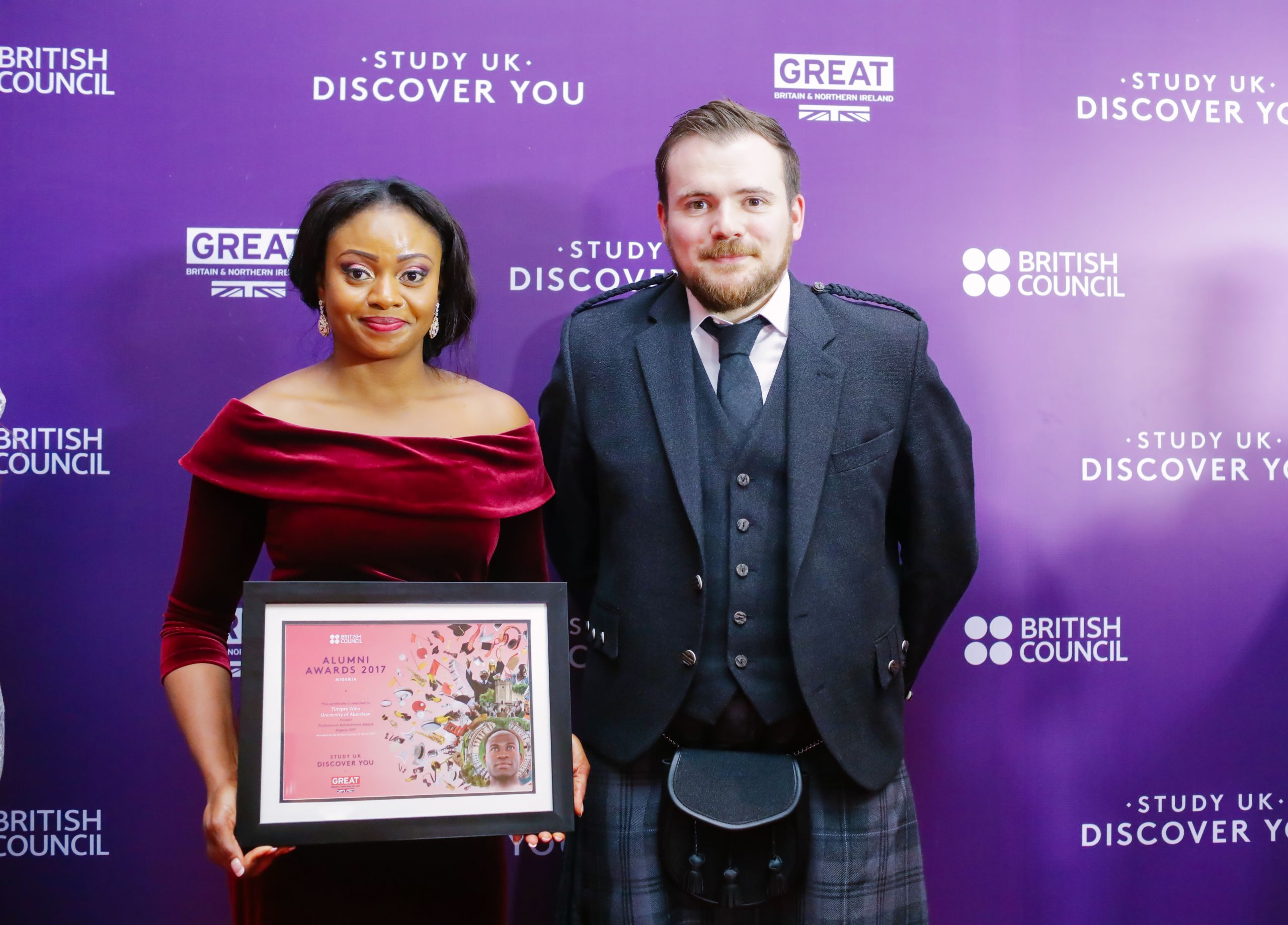 Timipre with a representative of the University of Aberdeen at the 2017 British Council Award Ceremony, Lagos