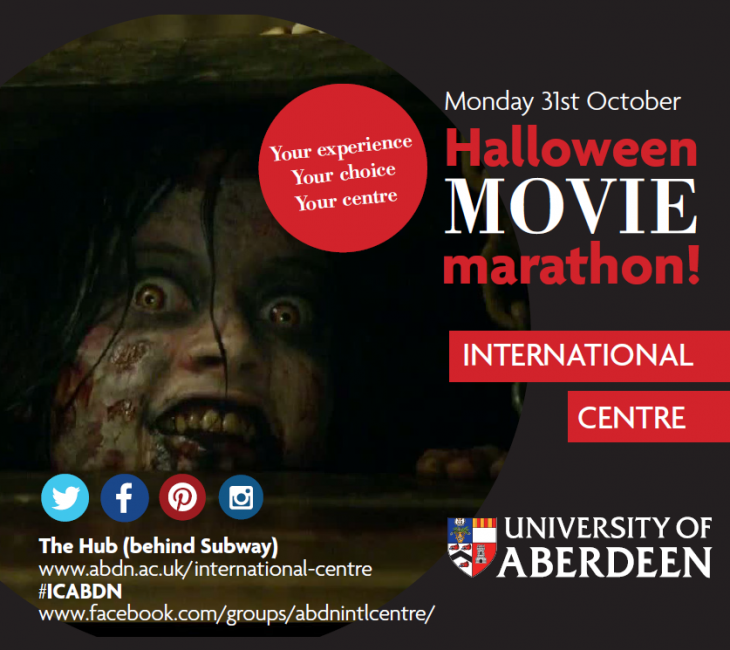 No plans for Halloween? Come to the International Centre for a horror movie marathon! Watch The Addams Family, Hocus Pocus, Sleepy Hollow and Practical Magic while meeting new people and having some Halloween candy or popcorn!