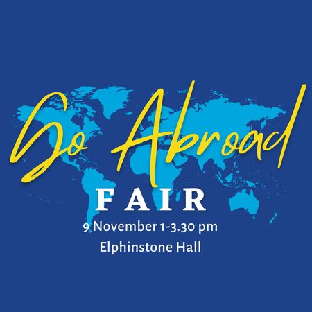 Come along to our Go Abroad Fair on Wednesday 9 November to find out more about international study and work opportunities for students and recent graduates. An information talk will be held at 13:00 in New Kings 6 (NK6), followed by the fair in Elphinstone Hall from 13:30-15:30.