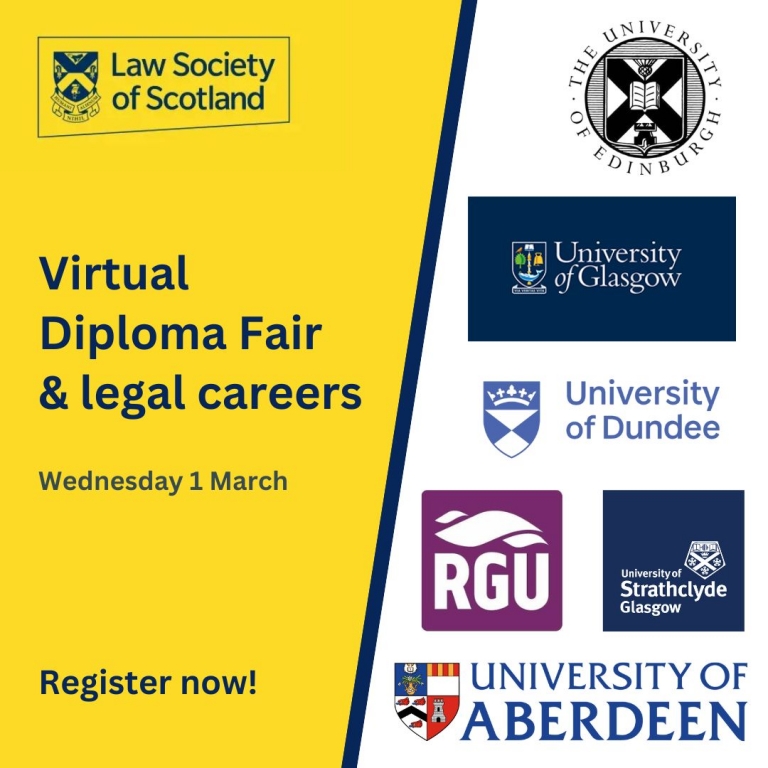 The Law Society of Scotland is organising a Virtual Diploma Fair and legal careers event on Wednesday 1st March from 9am-14:30pm. After the success of their virtual law-fair-style Diploma fairs, they are once again running the event online in 2023. This fair will be combined as we hear from all six Diploma providers which will then be followed with two panel sessions on traineeship applications and career options after the traineeship. Register below: