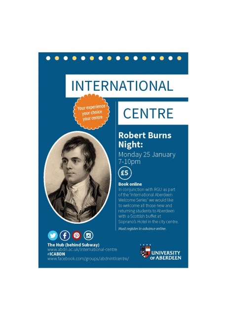 Robert Burns is one of the most celebrated poets in Scottish history. Most notably known for 'Auld lang syne', RGU & AU are hosting a dinner in his honour on Monday 25th January.