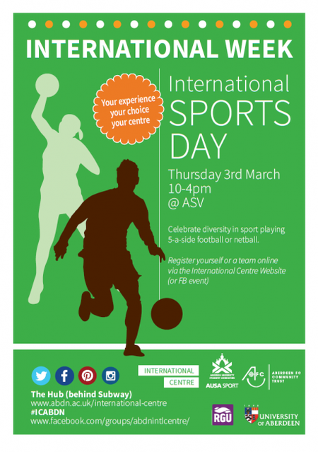 As part of International Week (29th Feb - 4th Mar) and as part of the International Aberdeen Welcome Project - AU & RGU are hosting two sports tournaments!! 5-a-side Football tournament on the indoor pitch at ASV Netball tournament in the Sports Hall at ASV Details: - £1/person to participate (bring the money on the day) - Match Tea & Awards afterward at the Bobbin - Register yourself (and we'll put you in a team) - Register your team already Register here for Netball and here for Football.- Hosted by