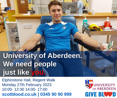 You can donate blood on Monday 27 February at Elphinstone Hall.