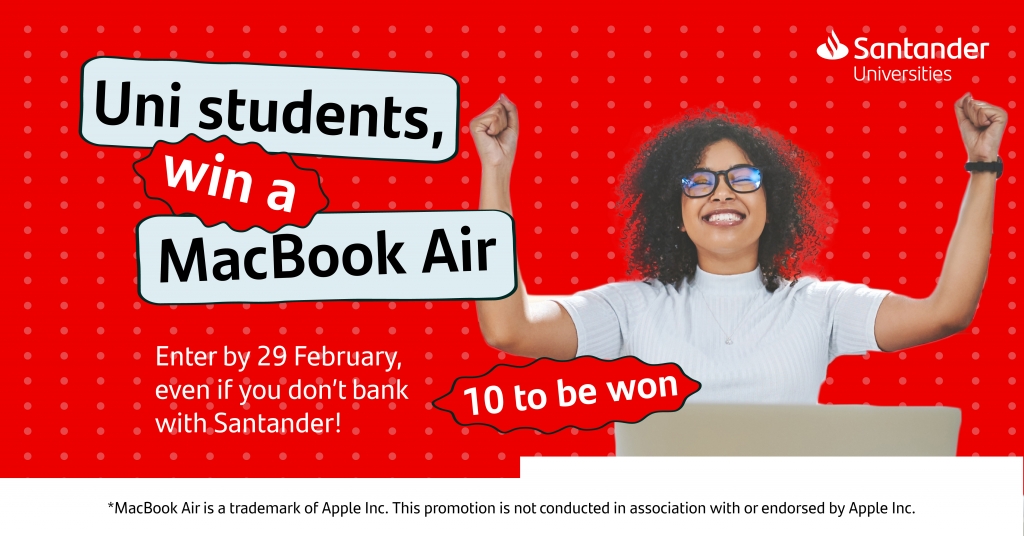 Back by popular demand, our partner Santander Universities, are once again giving away 10 MacBook Air laptops in their latest student prize draw. From seamless research to cutting edge creativity, having access to the latest tech can help you unlock a new level of academic excellence.