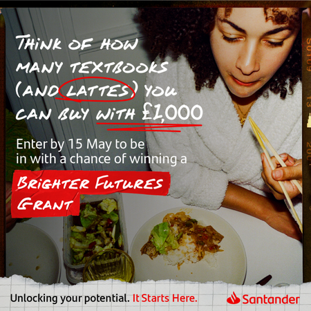We’re giving away 10 grants of £1,000 each. All of you are eligible, including undergraduates, postgraduates, part-time and full-time students. Whilst this initiative is run in partnership with Santander, you also don’t need to bank with them to participate!