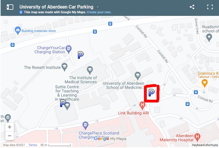 Parking is limited at the Foresterhill campus as it shares a site with the city hospitals. Visitors should only park in the University of Aberdeen car parks. The best car park to park in is outside the Polwarth Building as shown below. There is also pay and display parking on Ashgrove Road West. Please avoid parking in NHS car parks.