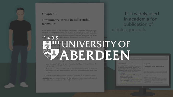 There are a variety of desktop and online LaTeX editors, including TeXMaker, TeXStudio, ShareLaTeX and Overleaf to name a few. We have featured a video tutorial produced by the University of Bath using the Overleaf editor. You can find the documents mentioned in the videos in the Links section below. The University of Aberdeen runs LaTeX workshops for PGR and PGT, and the workshop material (handouts and examples) can be downloaded as a ZIP in the Guides section.